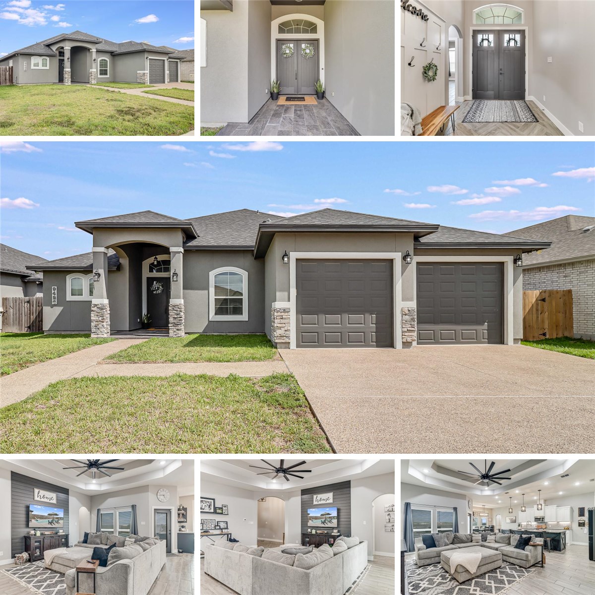 Step into style, comfort, and function in this beautifully crafted, custom-built home located in the highly sought-after Tuloso Midway School District. Just 5 years old & meticulously cared for, this residence is nestled on a generous 0.21-acre lot and thoughtfully designed with a tri-split floor plan that offers privacy & versatility. From the moment you walk through the striking double 8-foot doors, you’re greeted by a grand foyer and soaring ceilings that set the tone for the elegance found throughout the home. Every detail has been thoughtfully curated—from shiplap accents to tile flooring throughout (no carpet!) and designer colors that create a clean, modern aesthetic. At the heart of the home, the impressive 13-foot island anchors a kitchen that’s perfect for prepping, hosting, or gathering. Each bedroom features generous closets, & 2 drop zones make organizing your day-to-day life effortless. Ready to entertain? This backyard was made for it! Step outside to your very own resort-style oasis, featuring an oversized covered patio and a fully equipped outdoor kitchen with a gas grill and mini fridge—ideal for cookouts and summer soirées. The sparkling saltwater swimming pool takes center stage with its built-in heater for cozy winter dips and a chiller to beat the Texas heat. Whether you're hosting lively pool parties, relaxing under the stars, or lounging—this space is an entertainer’s paradise. Plus, there’s still plenty of lush yard space left for games, gatherings, and fun in the sun! This SHOWSTOPPER checks ALL the boxes—and then some!